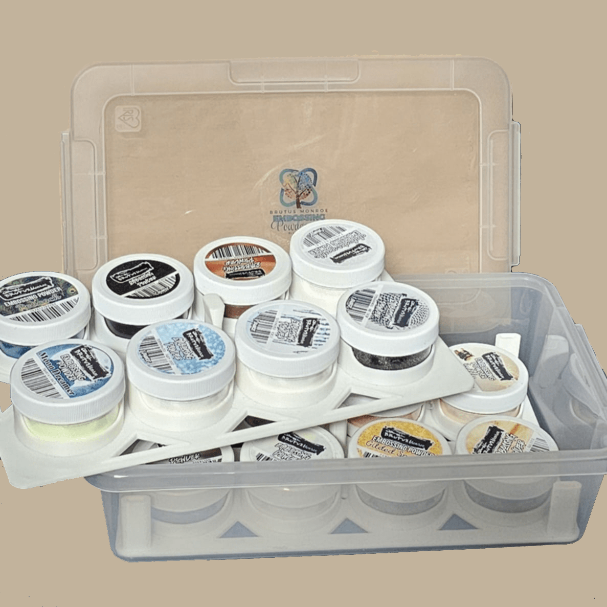 The 3D printed insert in this case (11.7" Long x 7.1" Wide x 3" Deep) is made to hold sixteen Brutus Monroe embossing powders. Securely hold your Brutus Monroe embossing powders on your desk or during transport to your crafting destination. You can have one for your dark colors, one for your light colors, and one for specialty items. Organize Brutus Monroe's amazing embossing powders so you always know where to find just the one you are looking for.